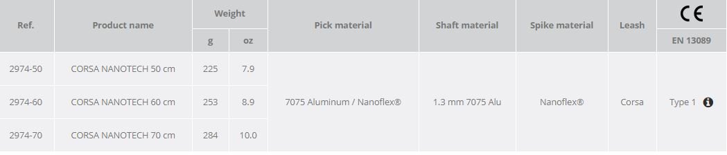 The Corsa Nanotech is the most advanced mountaineering ice axe on the market. It merges the hyperlight properties of aluminum construction with a Sandvik Nanoflex steel reinforced tip and spike for a solid grip on hard snow and ice. The steel components dramatically increase the performance of these critical points without significantly increasing the weight of the axe. The single-curve shaft provides extra clearance without interfering with walking or plunging performance. A lightweight nylon spike plug keeps snow out of the shaft. The grip is machined for good handling and a small slot in the head allows for seamless integration with the Corsa leash (sold separately).